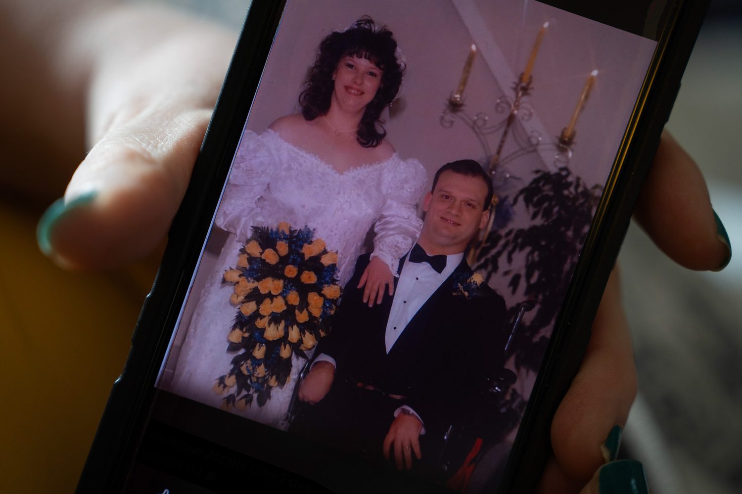 Estes comparte una foto de su boda en su residencia de ancianos en Dallas. Después de que su marido de casi 30 años falleciera en 2021, la salud de Estes se deterioró rápidamente, dejándola sin poder caminar.